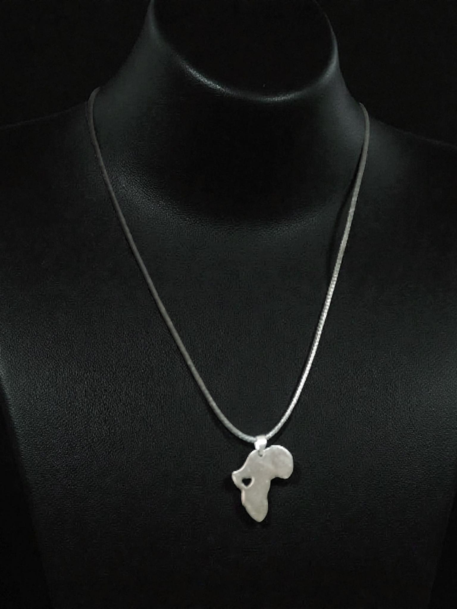 Edelstahl Halskette in der Form des afrikanischen Kontinents, versehen mit einem kleinen herzförmigen Ausschnitt und einem Korbiner-Verschluss. Unisex-Design.